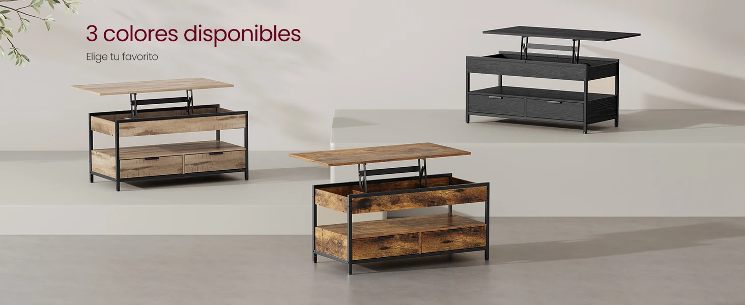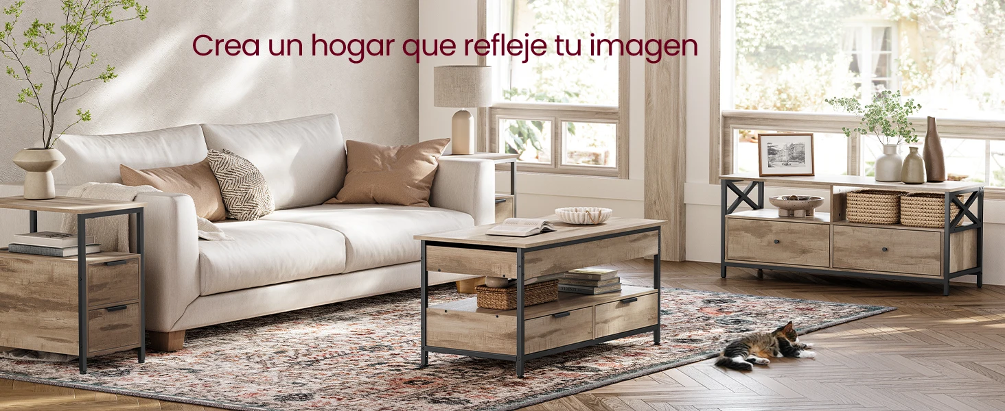 Gracias a su altura ajustable (48–63 cm), puedes trabajar, comer o relajarte desde el sofá de manera cómoda. Además, su inteligente sistema de almacenamiento incluye 3 compartimentos ocultos, 2 cajones y un estante abierto, para mantener mantas, revistas y objetos esenciales organizados y fuera de la vista.