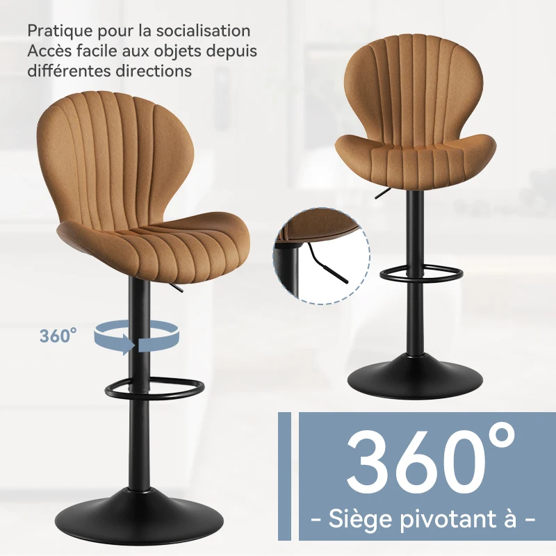 Gracias a su altura regulable y al sistema giratorio 360°, los taburetes se adaptan fácilmente a distintas alturas de barra y a diferentes momentos del día, aportando libertad de movimiento y practicidad en el uso diario.